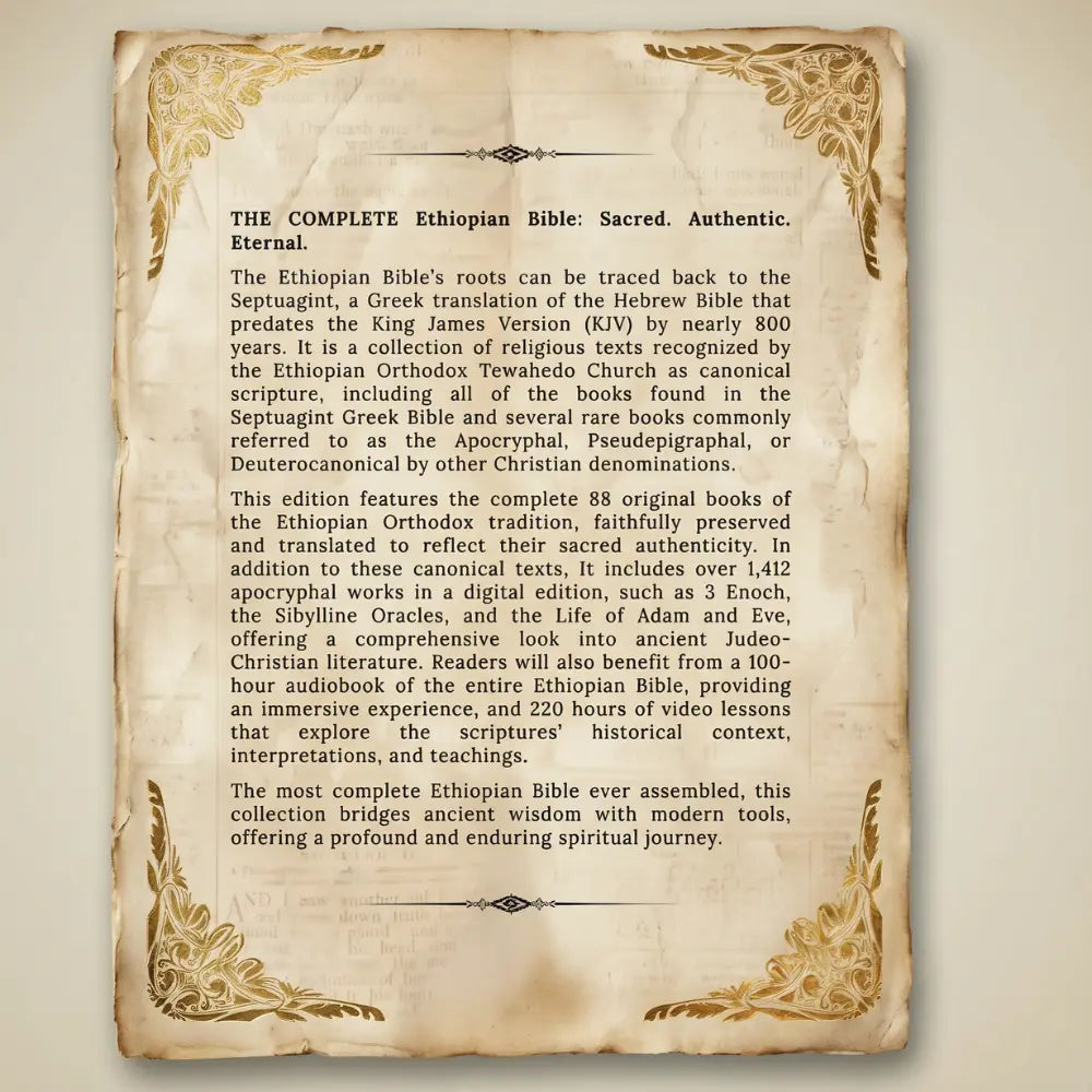 This is a faithful English translation of the Ethiopian Orthodox canon. Ethiopia's Christian tradition predates most Western denominations—the Ethiopian eunuch in Acts 8 is considered one of the first Gentile converts. These scriptures have been continuously used in Ethiopian worship for centuries.